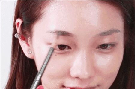 Step3:画眉毛1分钟。先勾画出眉毛轮廓,然后轻扫填充。倪妮的眉毛细长,显得清秀,唐艺昕的眉毛较宽,显得可爱,但是注意都不要画太重。