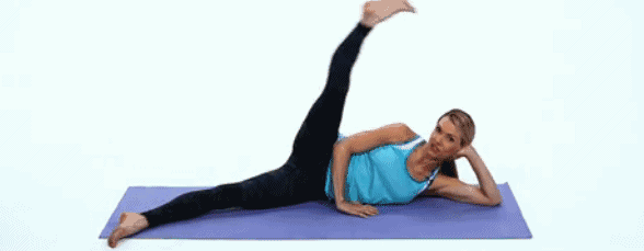 动作1 侧躺,将腿抬高至极限,20下为一组,做5组,做完一侧换另一侧。